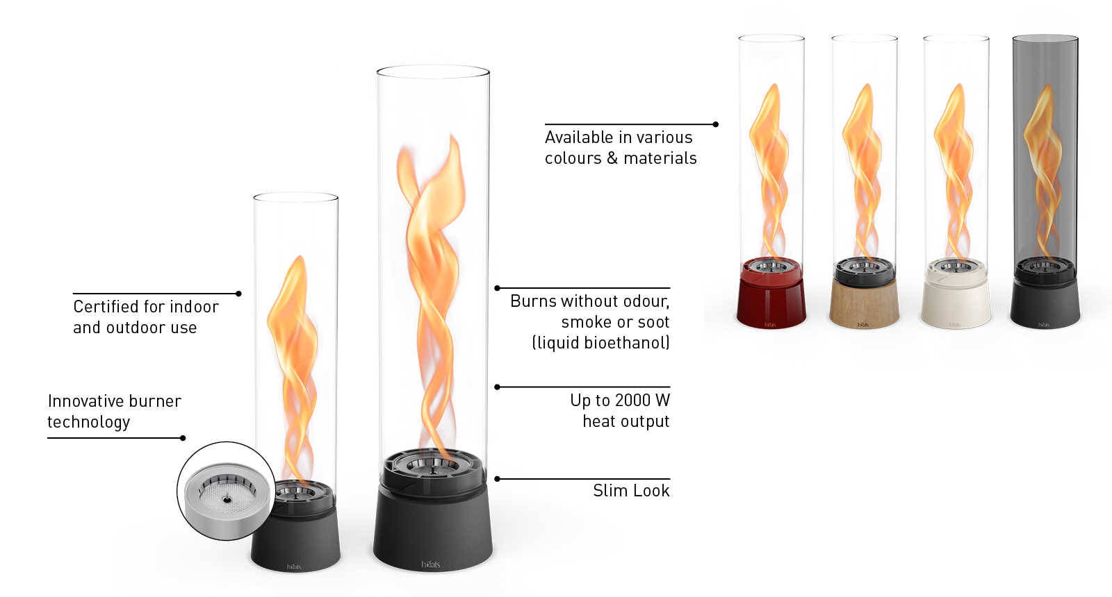 - Odourless, soot-free and smoke-free thanks to organic höfats bioethanol liquid fuel